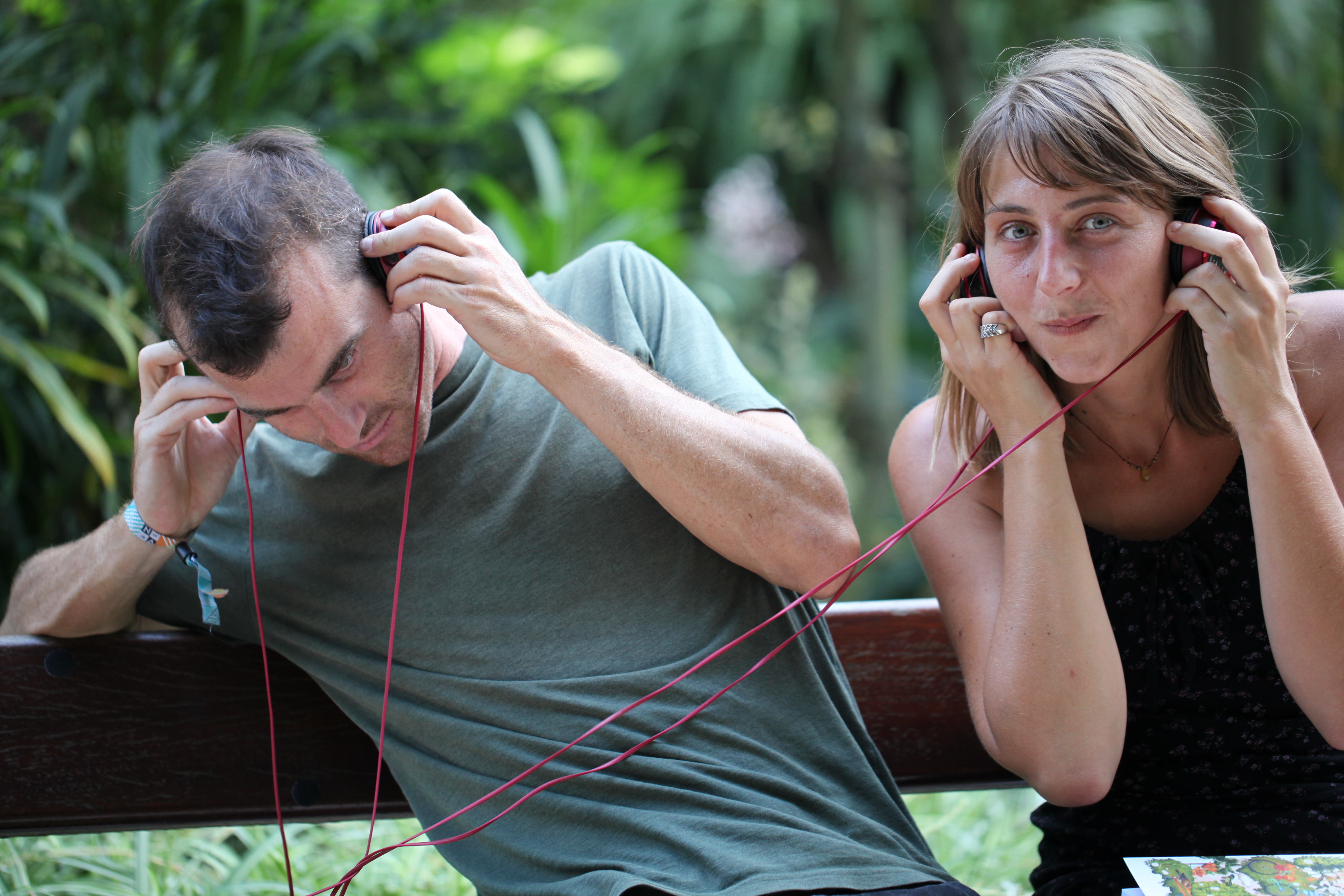What is proposed is a verbal exchange on the soundscapes of the life of the visitor, followed by their exploration, removing the monophones and combining them close to their ears, of the sound identities of Berlin, Lisbon, Paris, Rio, Leicester, Munich. Sometimes the result of having one ear listening to a city and one following the sounds of another is a stereo cacophony might be as dificult to experience simultaneously as it is to carry the memory of life in very distinct places.